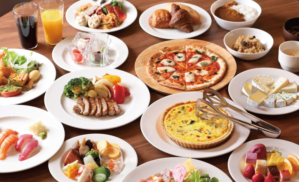 -メニュー一例 – 【ライブキッチン】 ・430℃の石窯焼きステーキ/野菜各種 ・石窯ココット料理 ・ピンサ ・生絞りモンブラン 【洋食】 ・ガーリックピラフ ・白身魚のソテー ・ゼッポリーニ ・アボガドと海老サラダ ・鶏肉のインボルティーニ ・コーンボール 他 【和食】 ・天婦羅 ・いくら鮭 ・ちらし寿司 ・魚の照り焼き ・うどん又は蕎麦 ・もつ煮込み 他 【中華】 ・酢豚 ・小籠包 ・海老焼売 ・茄子の麻婆和え ・中華ちまき 他 ごはん・ガーリックピラフ・ラーメン・パン・スープ サラダ・チーズ デザート・フルーツ ソフトドリンク |