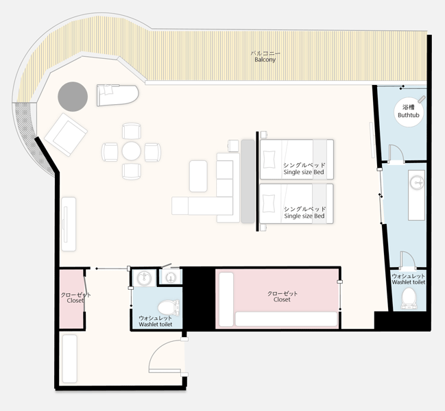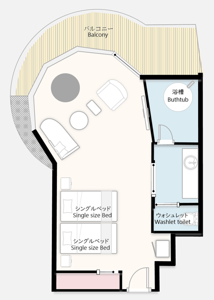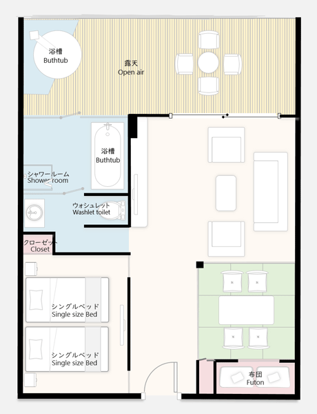 | ベッドサイズ | 幅110cm × 縦200cm 2台 ※3名様以上でご利用の場合はエキストラベッド、もしくはソファベッドが入ります。 |
