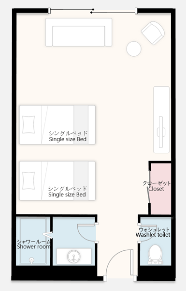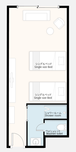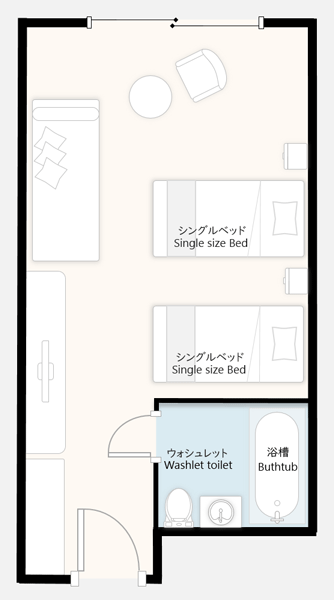 | ベッドサイズ | 幅110cm × 縦200cm 2台 ※3名様以上でご利用の場合はエキストラベッド、もしくはソファベッドが入ります。 |