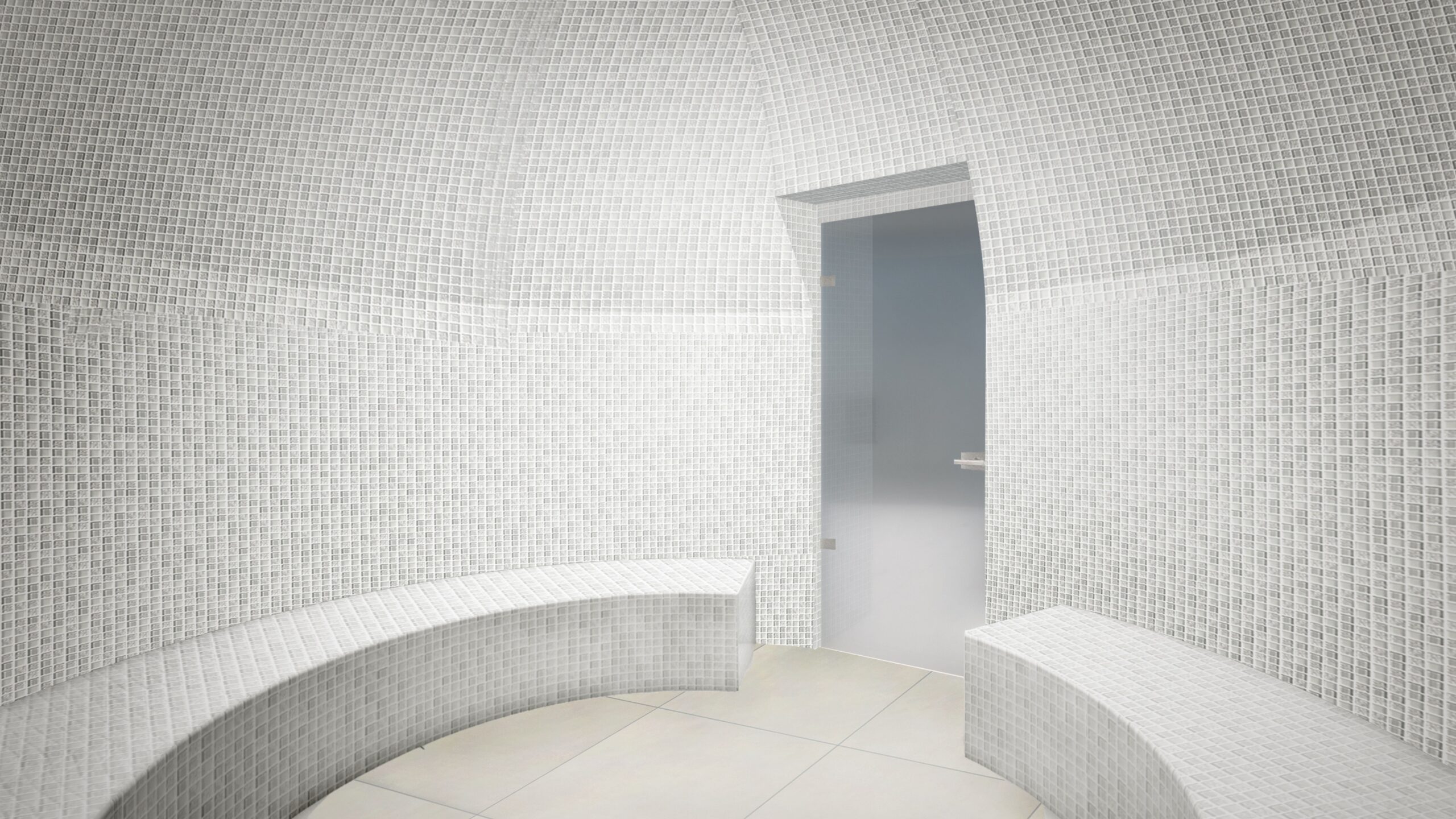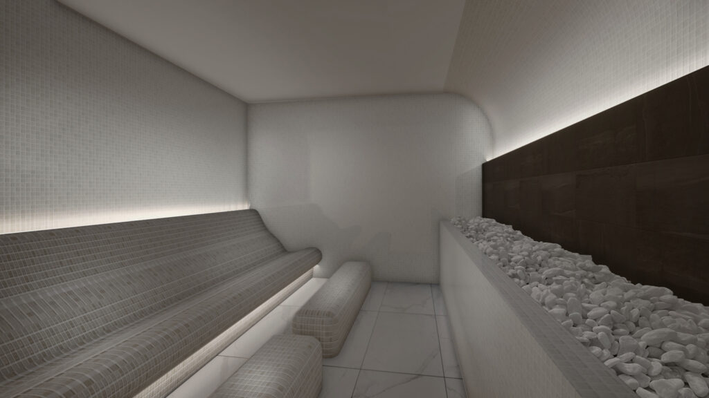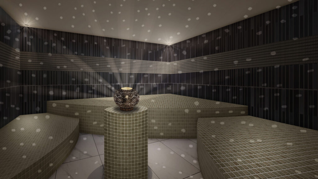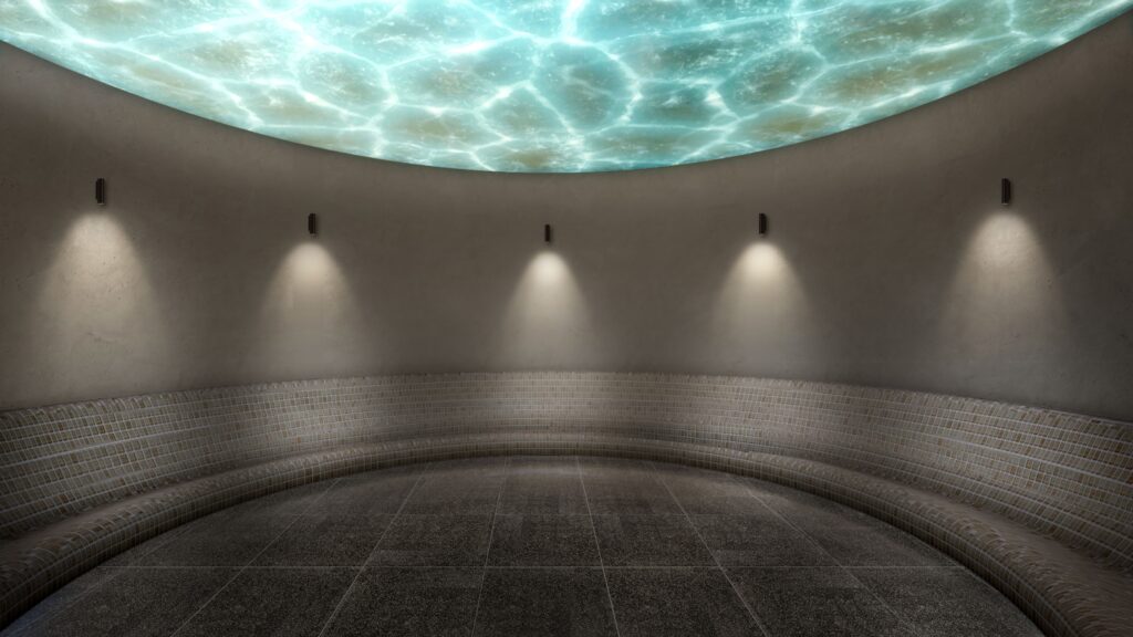 微温で静かにリラックスして過ごせるルーム。天井に映し出される映像で異次元へいざなわれるひとときを。