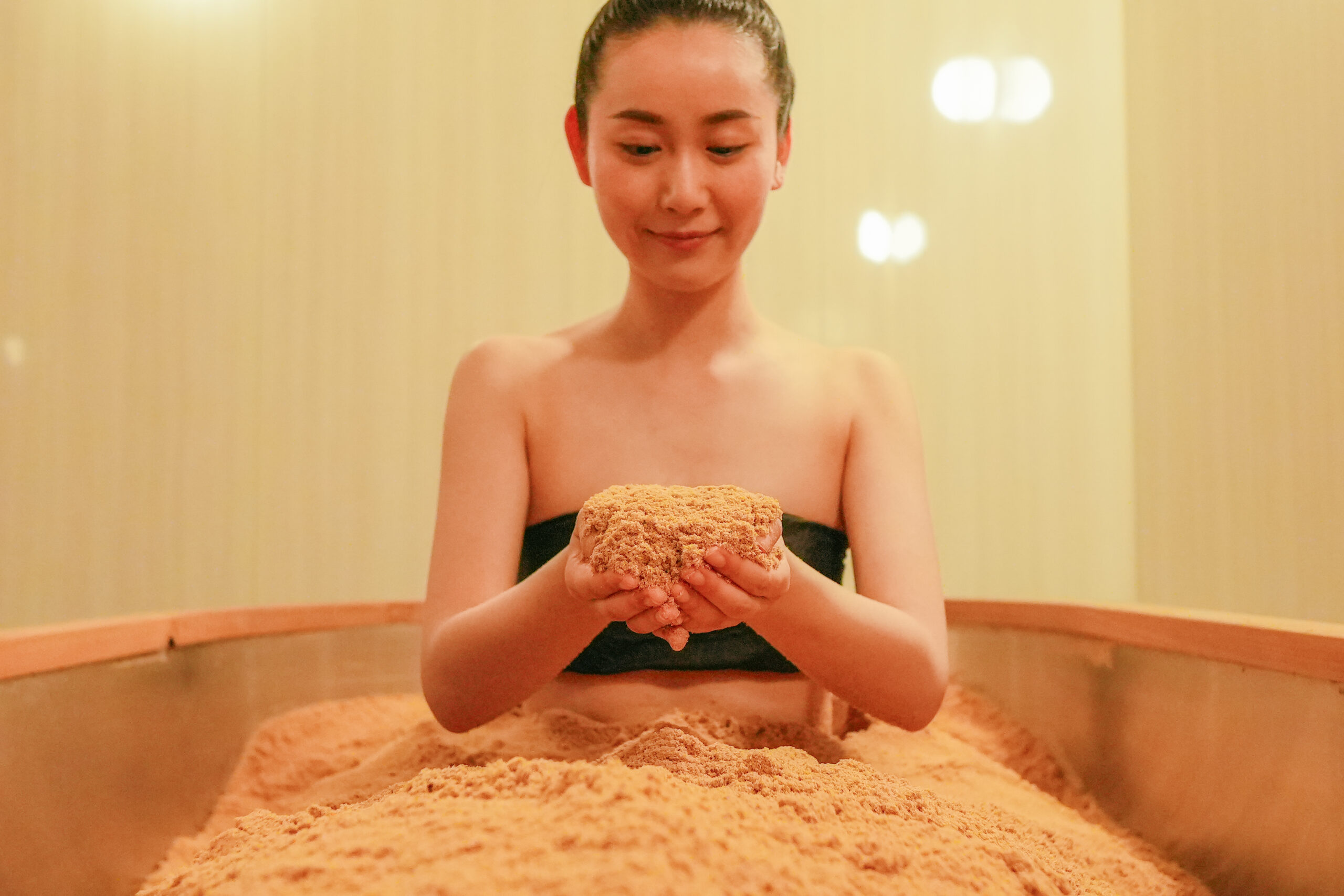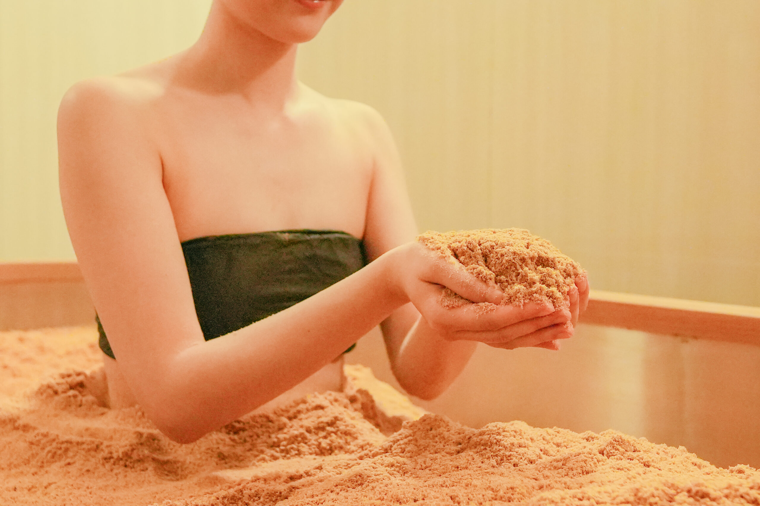 当店の木浴は、国産無垢ヒノキパウダーとヒノキの生葉、少量の米ぬかのみをブレンドしております。電気やガスは使用せず、自然発酵で約65~80℃になったパウダーで全身をお包みします。